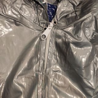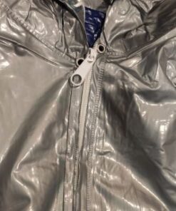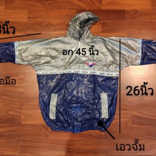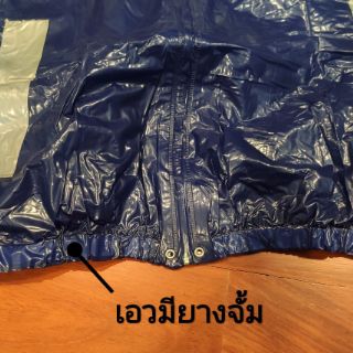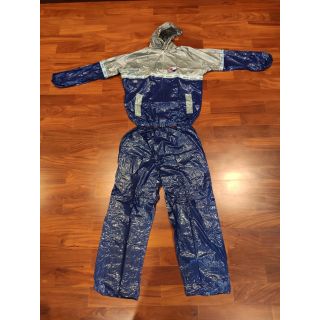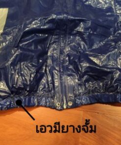 เนื้อ PVC แบบธรรมดา ตัวเสื้อมีซิปหน้า หมวกในตัว ด้านหลังของเสื้อมีช่องระบายอากาศ แขนเสื้อและเอวเป็นแบบจั๊ม กางเกงขนาดฟรีไซต์